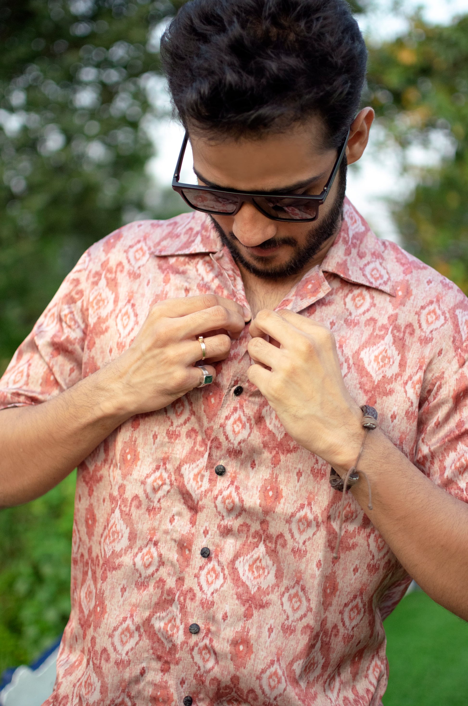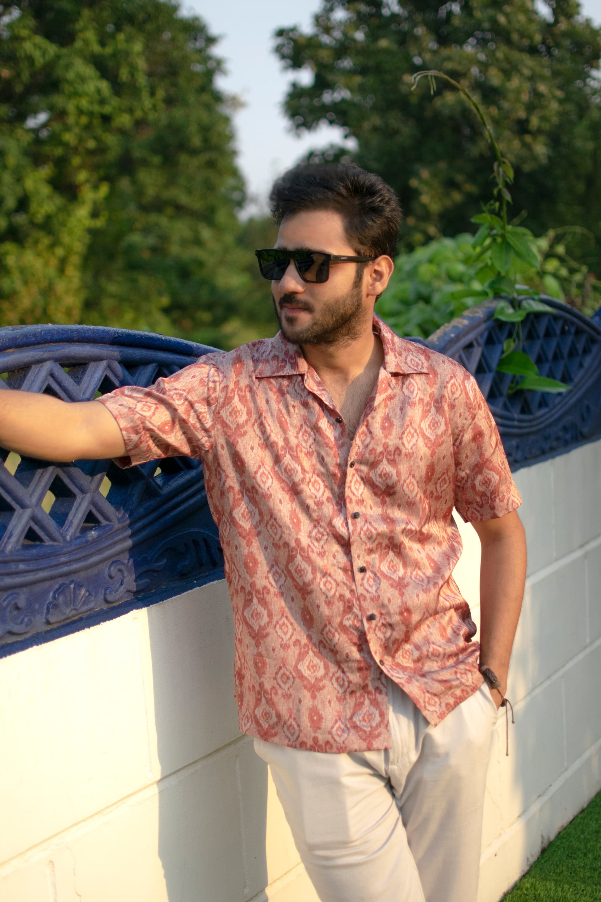 Embrace the spirit of artisanal charm with our Terracotta Ikat Linen Silk Shirt, where tradition meets contemporary style. Showcasing a classic Ikat-inspired print in earthy terracotta and soft beige tones, this shirt is handcrafted from a luxurious linen-silk blend that ensures breathability with a subtle, elegant sheen. Its relaxed silhouette, short sleeves, and camp collar create a laid-back yet refined look—perfect for warm-weather days or an evening outdoors.